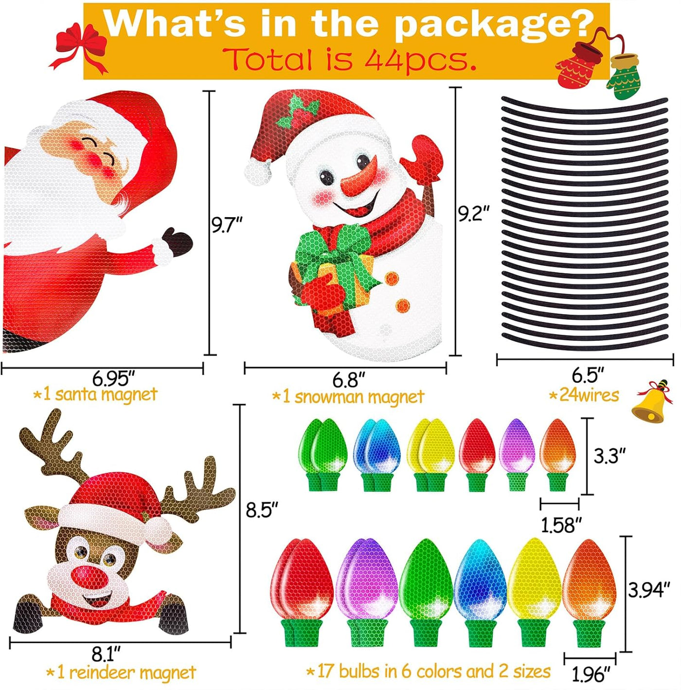 44PCS Magnet Set: Includes 17 Christmas bulb-shaped magnets in 2 sizes (6 colors: 3 red, 2 orange, 3 yellow, 3 green, 3 blue, 3 purple; Small: 3.3" x 1.58", Big: 3.94" x 1.96") + 24 wire-shaped magnets (6.5") + 1 peek-a-boo Santa magnet (9.7" x 6.95") + 1 peek-a-boo reindeer magnet (8.1" x 8.5") + 1 snowman magnet (9.2" x 6.8"); U.S. copyright obtained in 2019