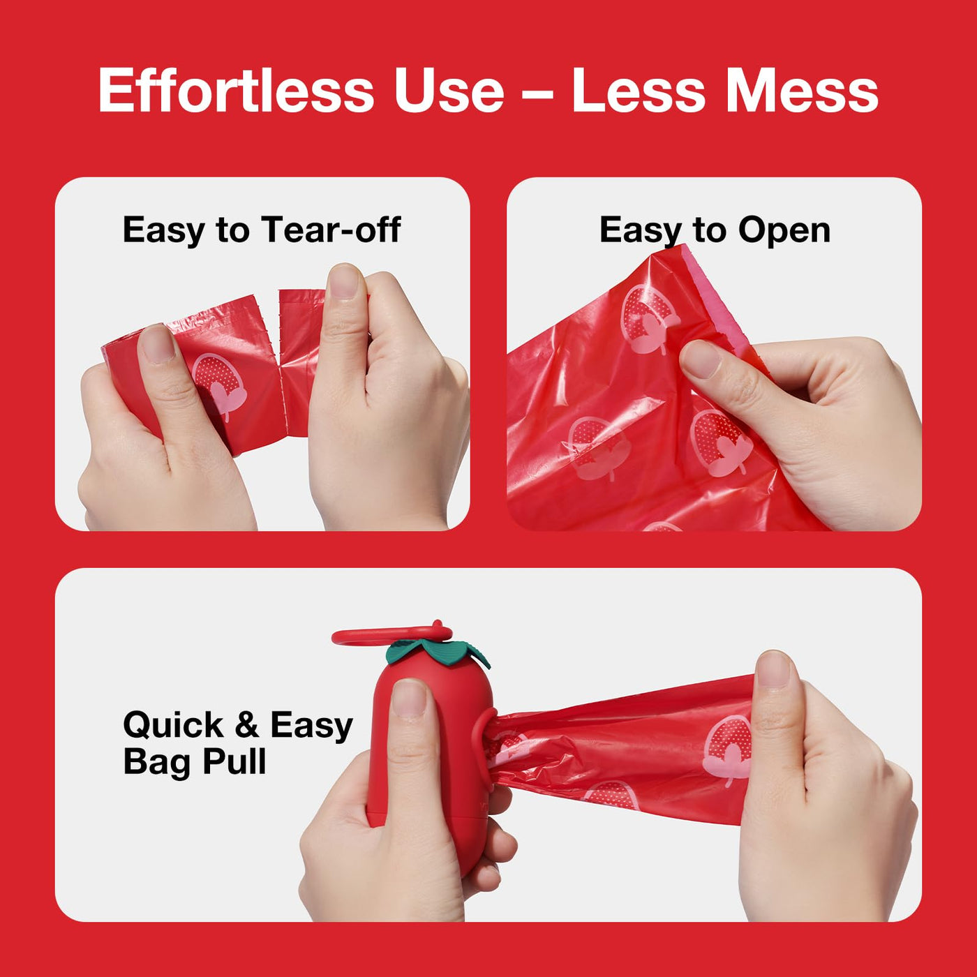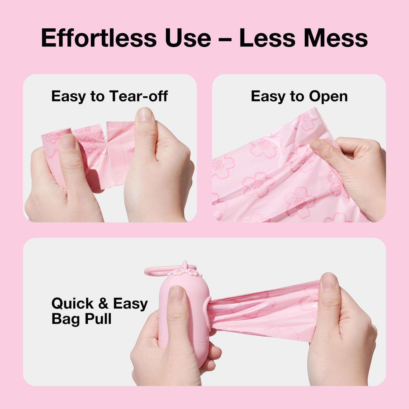 CHERRY BLOSSOM SCENTED: The poop bags use the fragrance of cherry blossoms. The smell of cherry blossoms is very comforting and pleasant. It can effectively reduce the unpleasant smell of dog poop and cat poop