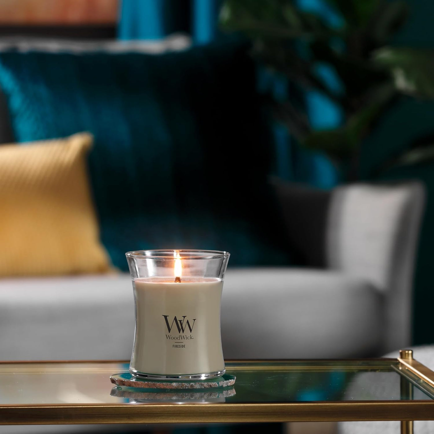 Richly fragrant and versatile, this WoodWick Medium Hourglass Candle invites a warm, comforting atmosphere into any home. With its Fireside scent, this 10oz candle uses a premium soy blend wax and Pluswick Innovation featuring a natural wood wick to create the delightful sound of a crackling fire. Through a balancing act of the natural scents of amber, vetiver, and musk, it perfectly captures the essence of a cozy evening.